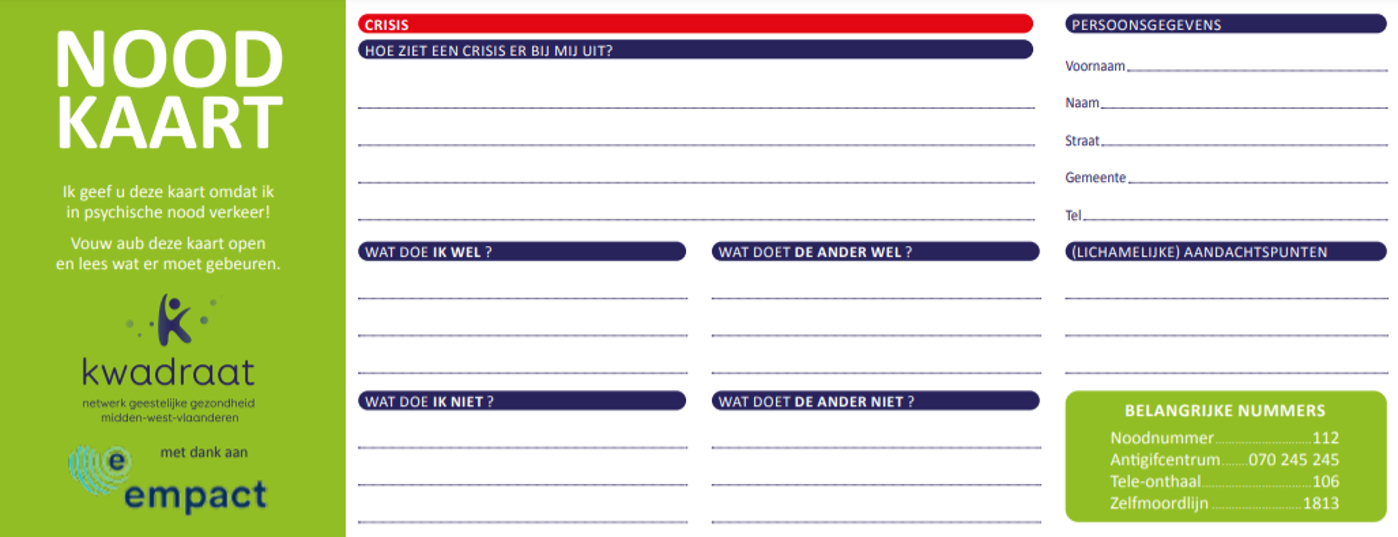| Op de noodkaart vind je als hulpverlener wat je kan doen wanneer de hulpvrager in een psychische crisis verkeert. | ||
