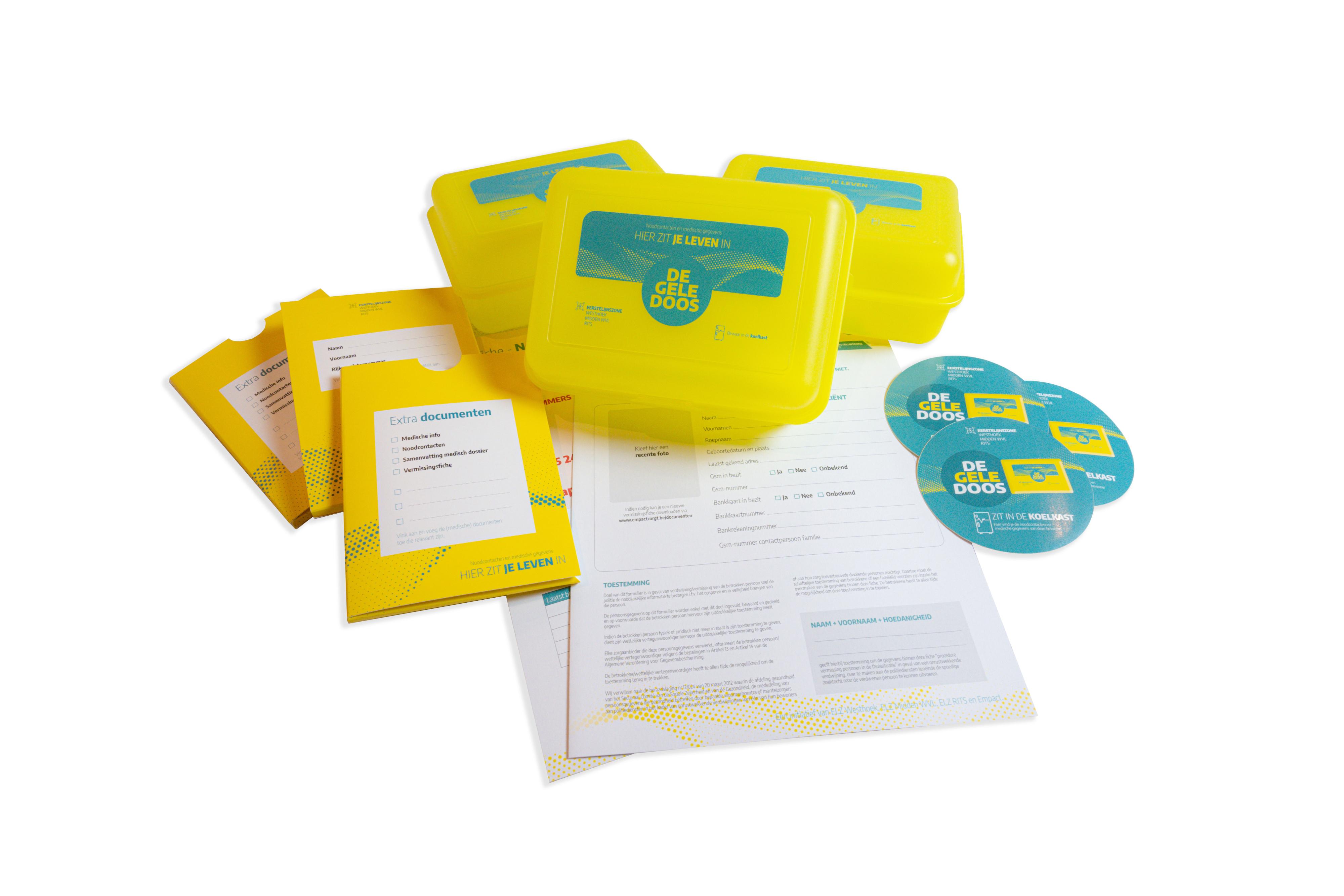 | De gele brooddoos bevat een infofiche met persoonlijke gegevens, noodcontacten en medische gegevens en wordt bewaard in de deur van de koelkast. De bijhorende sticker vertelt hulpverleners bij een noodinterventie dat ze in een Gele Doos in de frigo snel alle noodzakelijke info kunnen vinden. | ||