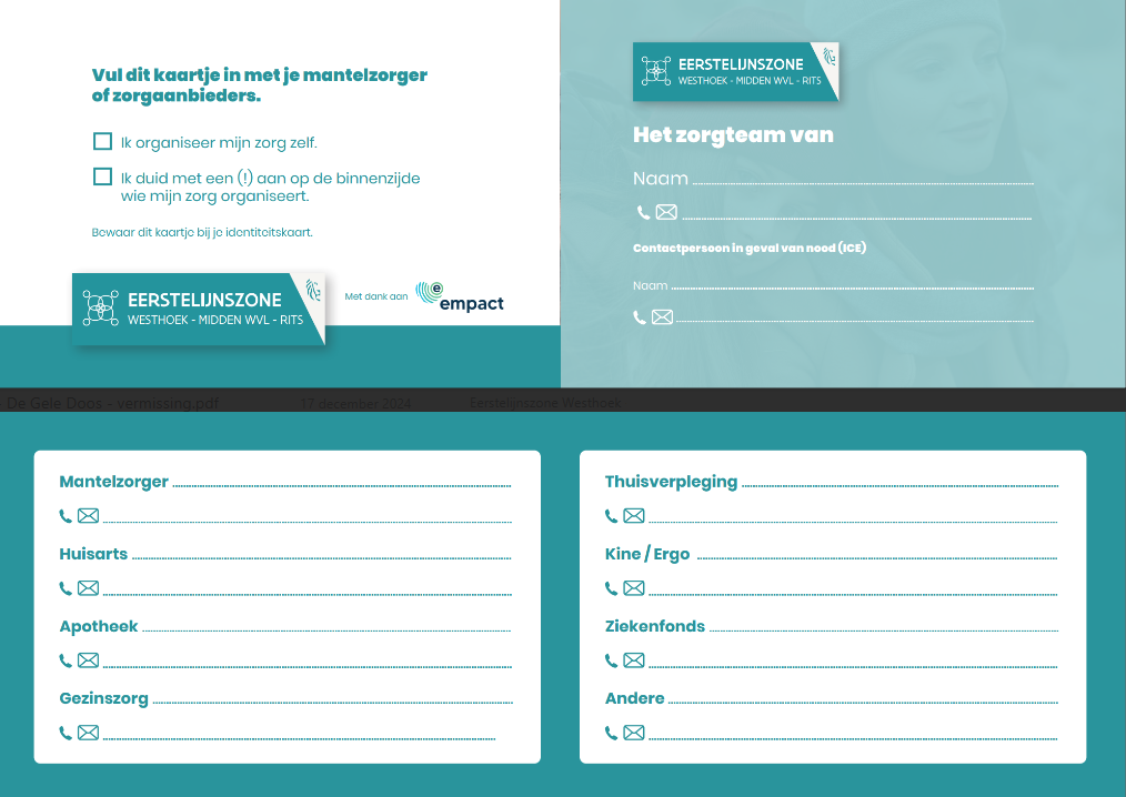 | Dit kaartje bevat de info/contactgegevens van de mantelzorger en de zorgverleners die frequent aan huis komen zoals thuisverpleegkundige, huisarts, apotheek... | ||