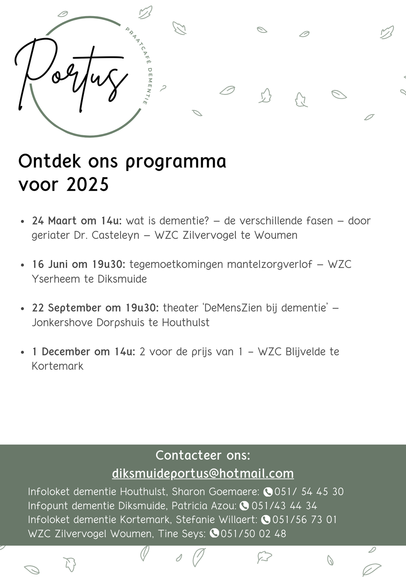 Vanuit de gemeente Diksmuide worden we geïnformeerd over hun acties en initiatieven. Vanuit Portus (praatcafe in Diksmuide, Kortemark en Houthulst) organiseren ze jaarlijks enkele activiteiten voor naaste betrokkenen. Hieronder kan je hun jaarplanning voor 2025 terugvinden:
