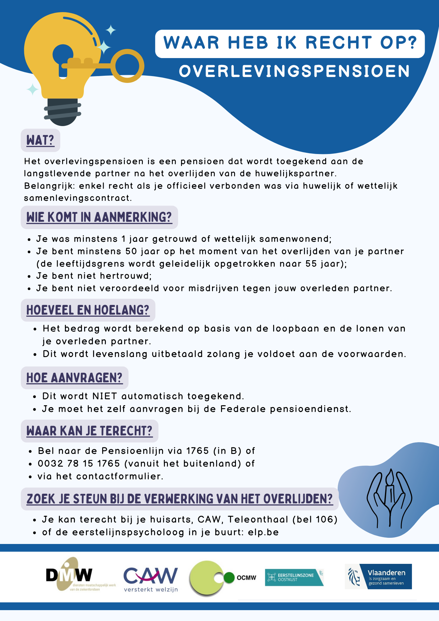 De West-Vlaamse GBO’s plaatsen op regelmatige basis een sociaal recht in de kijker. Via een overzichtelijke flyer willen we deze informatie visualiseren naar de burger toe. Op deze manier wil men onderbescherming tegengaan voor de meest kwetsbaren in de samenleving en ervoor zorgen dat iedereen zijn of haar rechten kent én ook gebruikt.